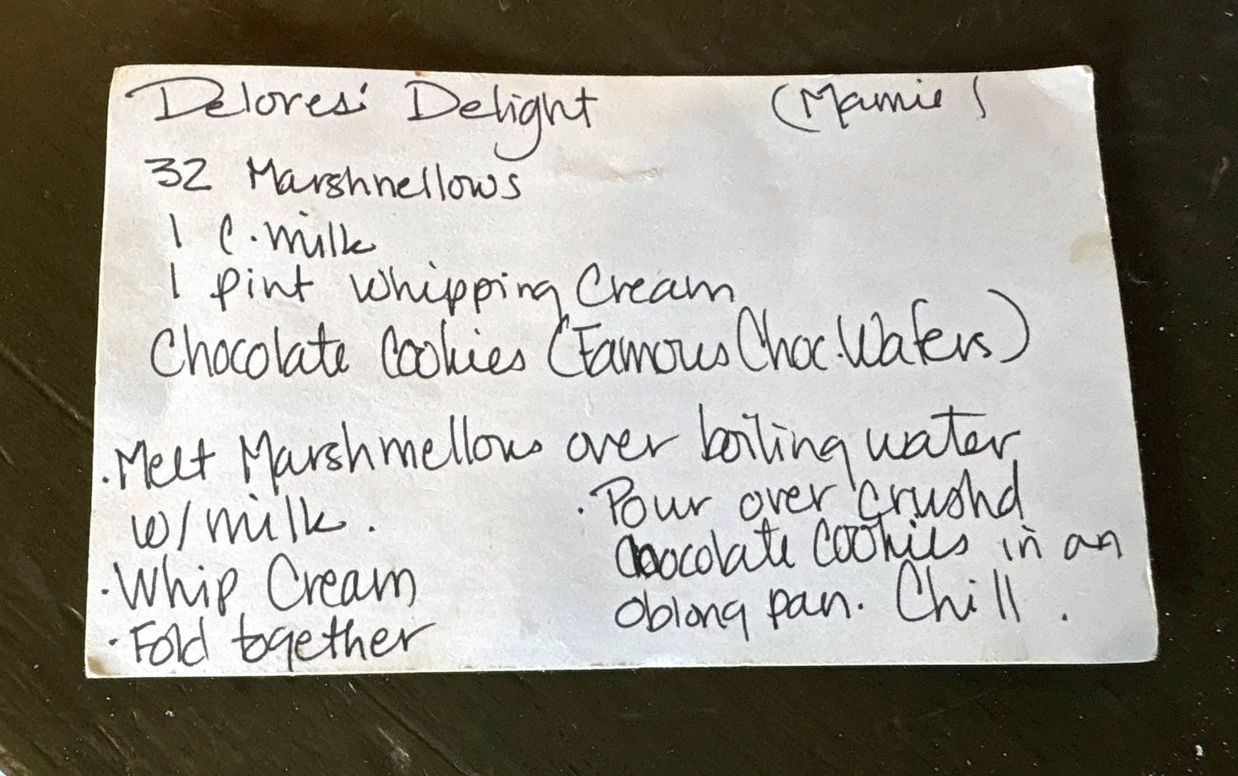 We had Delores’s Delight for dinner last night, and it made me think of all those sweet midnight dates with my dad. Those memories reminded me of others with him that I will always cherish. I guess life’s recipe is simple but exact. Combine the good with the bad and do everything we can to fold it together into a life in which you can delight, and others can, too.